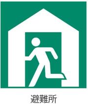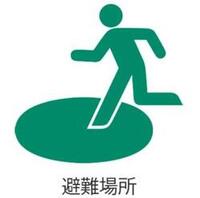 避難場所は地面のその場所を示す緑のマルのところに人が行くようなマーク