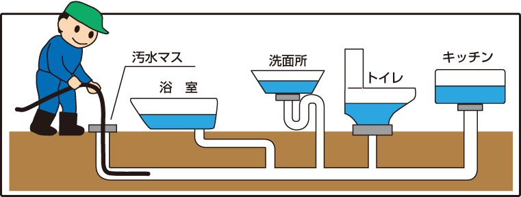 もし、水まわり各所の屋外に出口のマスのある場合は、それぞれの場所の汚れを確認しながら行うことが出来ます。